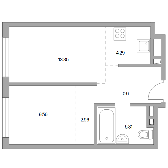 Сдача в 2027 году 13.35, 9.56 м2 4.29 м2
