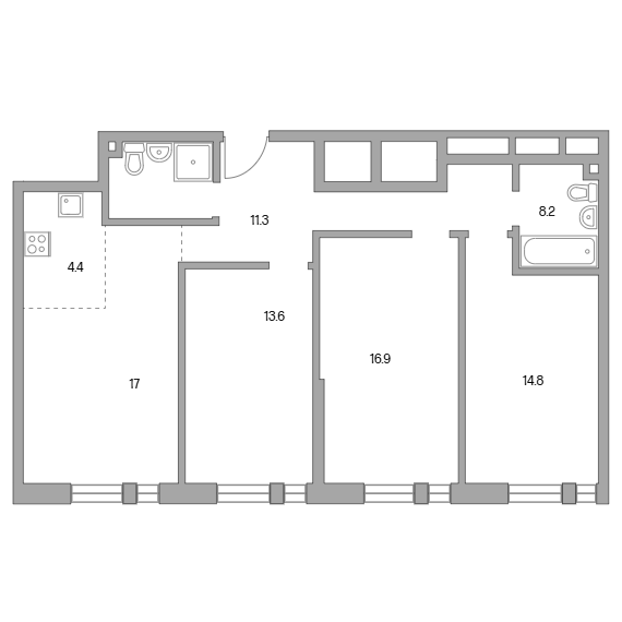 Сдача в 2028 году 13.6, 14.8, 16.9, 17 м2 4.4 м2