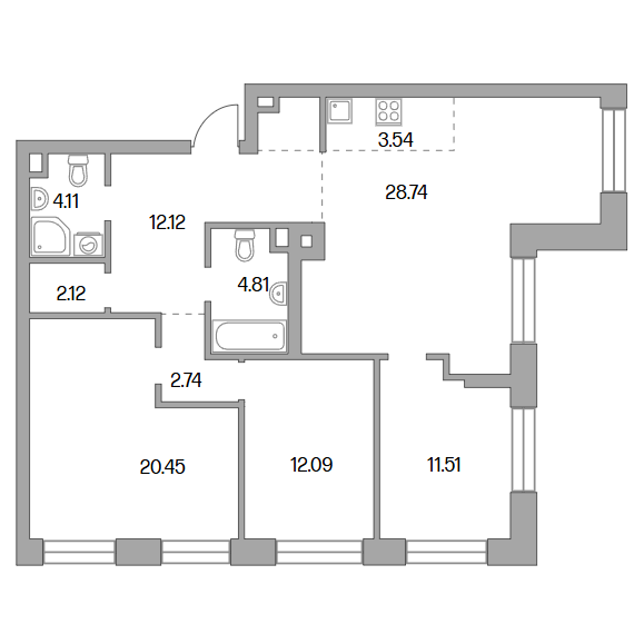 Сдача в 2028 году 11.51, 12.09, 20.45, 28.74 м2 3.54 м2