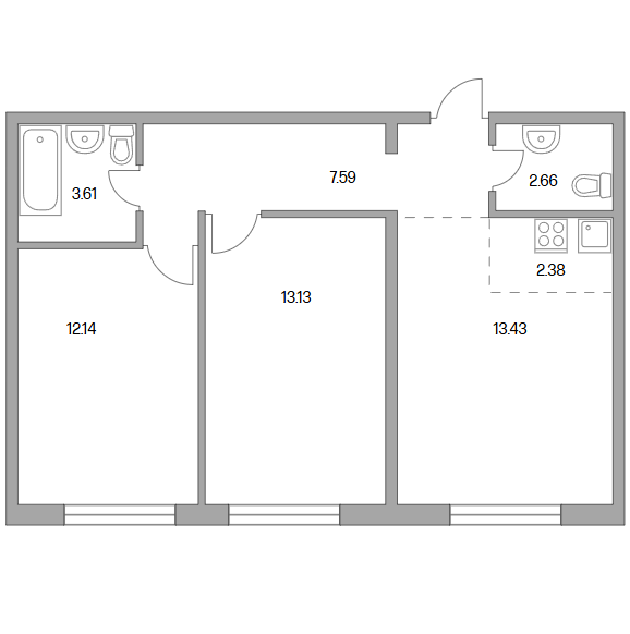 Сдача в 2026 году 12.14, 13.13, 13.43 м2 2.38 м2