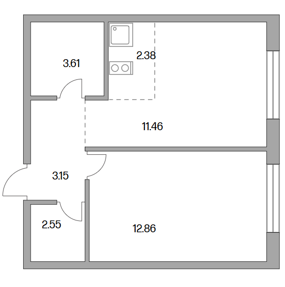 Сдача в 2026 году 11.46, 12.86 м2 2.38 м2