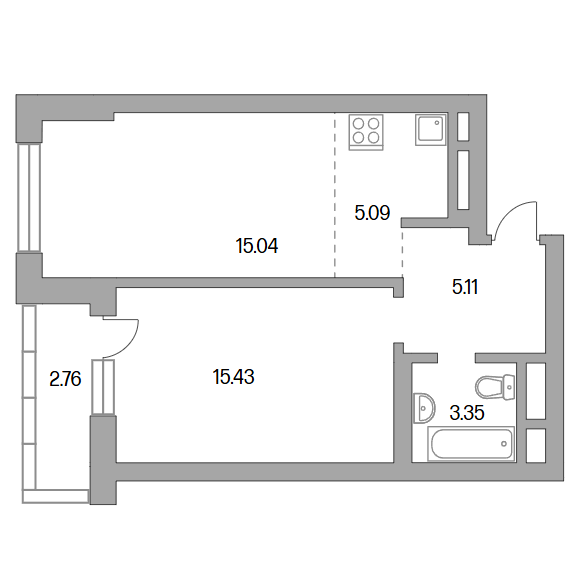 Сдача в 2028 году 15.04, 15.43 м2 5.09 м2